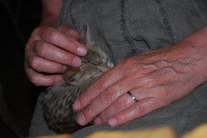 Het is hier al erg warm en benauwd geweest (40 graden), maar in Italië stellen ze geen Nationaal hitteplan op bij 4 dagen lang temperaturen boven de 27. Tot ongeveer 32 graden is het hier standaard elke dag en dan vinden wij het koel (komt ook door het briesje of een iets harder briesje). De poesjes hebben bezit genomen van de piazza. Ze zijn uit de trullo vertrokken en slapen nu in de houtstapel. Het is mooi om van zo dichtbij mee te maken hoe hun moeder een echt opvoedplan heeft. Zo ving ze bijvoorbeeld een paar avonden achter elkaar voor elk kleintje een muis, alsof ze kon tellen. Inmiddels weten ze wat ze daarmee kunnen doen, opeten! Ook het hele process van zindelijk worden, vast voer eten (alhoewel haar enige overgebleven zoon nog wel heel graag aan haar tepeltjes sabbelt) en weer uit bomen naar beneden klimmen, is doorlopen. Ondanks dat moeders nog zo jong is, weet ze precies wat ze moet doen. Wij zijn trots op haar. De kleintjes zijn helemaal aan mensen gewend en klimmen op elke beschikbare schoot. Zelfs al ben je niet erg dol op katten, je kunt niet anders dan vertederd raken van zo’n lief klein bundeltje.